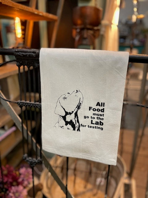Introducing the Lab Testing Kitchen Towel, featuring a humorous design of a Lab waiting for his food to test.